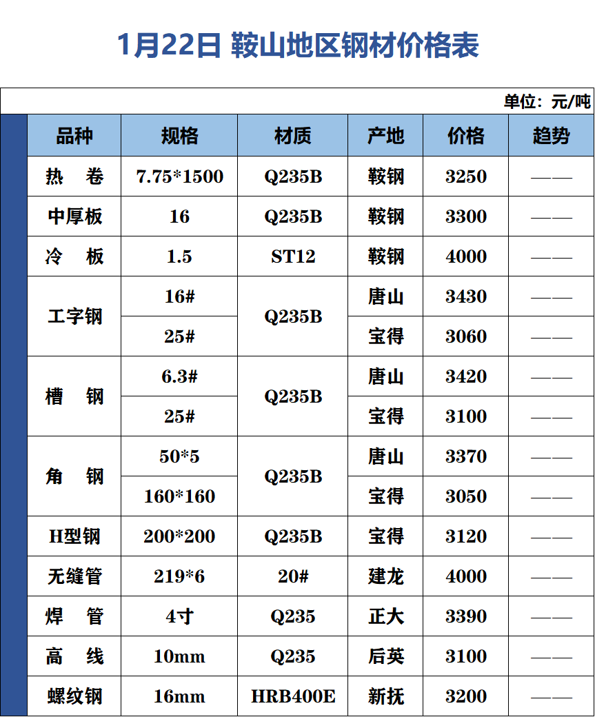 1月22日 鞍山地區(qū)鋼材價(jià)格表