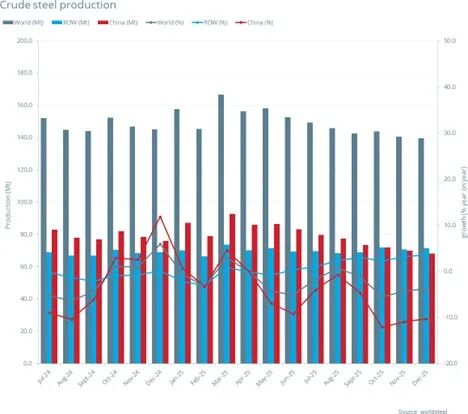 2025年12月全球70個(gè)納入世界鋼鐵協(xié)會統(tǒng)計(jì)國家/地區(qū)的粗鋼產(chǎn)量為1.396億噸,同比下降3.7%。