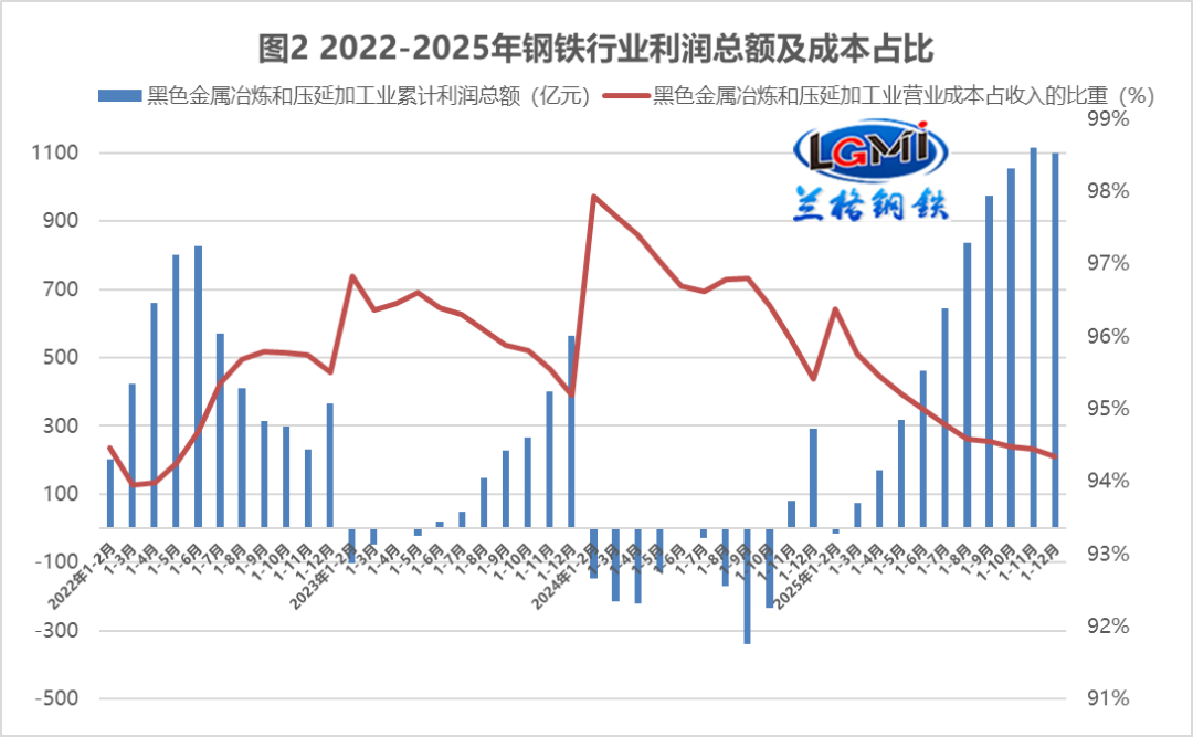 據(jù)國家統(tǒng)計局?jǐn)?shù)據(jù)顯示,2025年1-12月份,黑色金屬冶煉和壓延加工業(yè)實現(xiàn)營業(yè)收入77268.3億元,同比下降4.7%;營業(yè)成本72899.0億元,同比下降5.7%;利潤總額1098.3億元,同比增長299.2%。蘭格點評